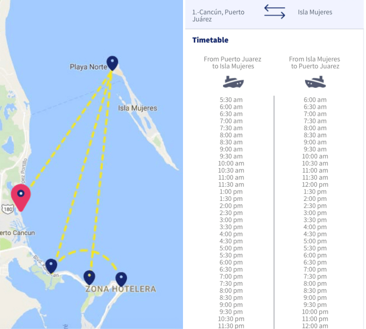We took the boat from Puerto Juarez because I heard it had more crossing times, the ferry leaves every 30 minutes. There are also boats around the hotel zone in Cancun if that’s convenient for you (Map below). Since we didn’t have a lot of time I didn’t want to risk waiting longer for the ferry, we went straight to Puerto Juarez and crossed from there. You can buy your tickets at the location, as soon as we arrived there was a lady with a little stand selling them, no line or anything. It cost us 300 pesos round trip. They also have a few restaurants where you can grab a drink and/or snack for the ride. The boat ride was about 18 minutes and super pleasant. There was even live music! You can store your luggage right when you get on and enjoy the view from the top deck. Make sure to bring sunscreen and a hat.
